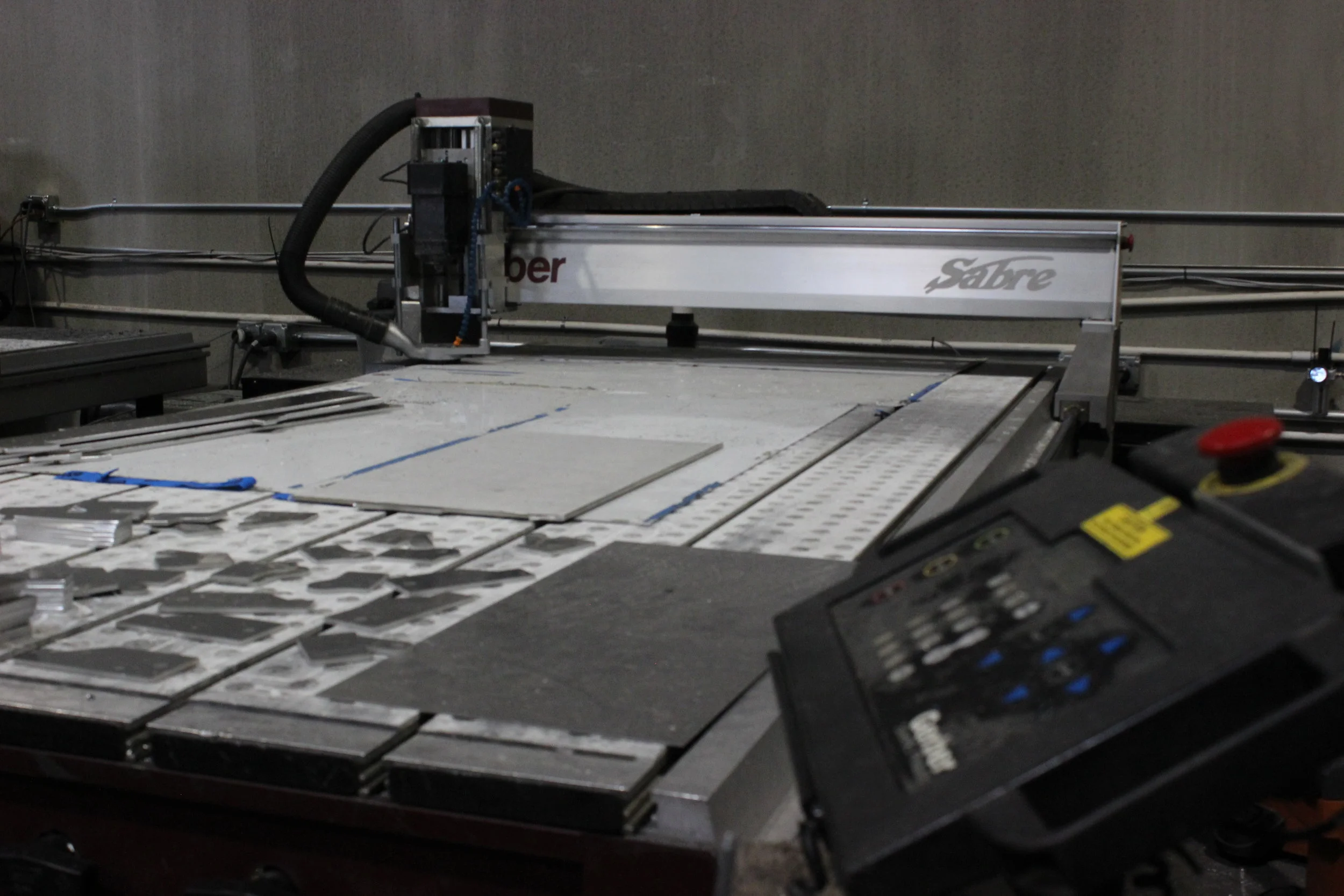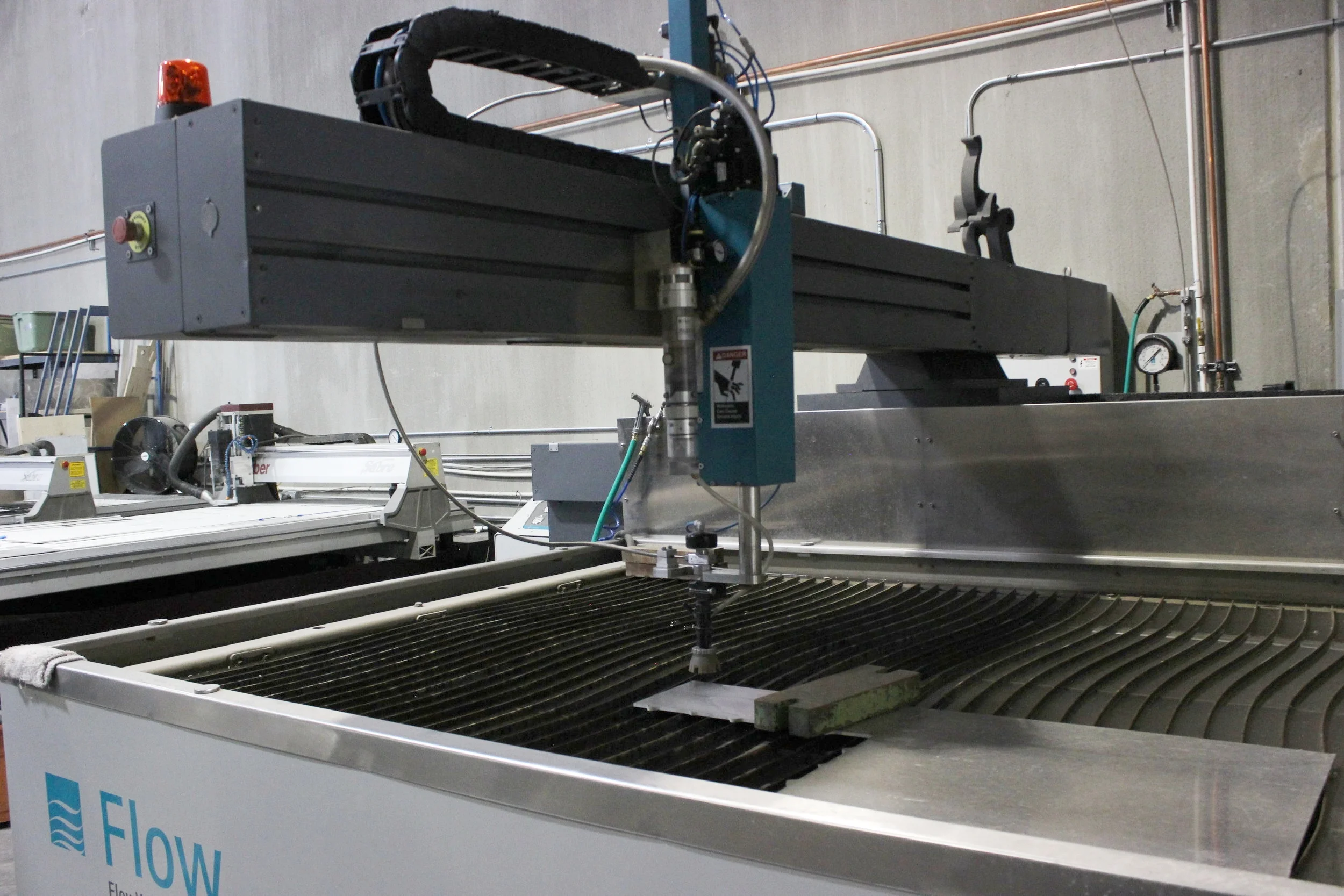 This bad boy can cut through almost anything. Our Flow Mach 2 water jet (Godzilla) has a cutting area of 6' x 10'. Using high pressure water and precision accuracy, our water jet cuts metals, plastics and even phone books - because who uses a phone book now anyway?